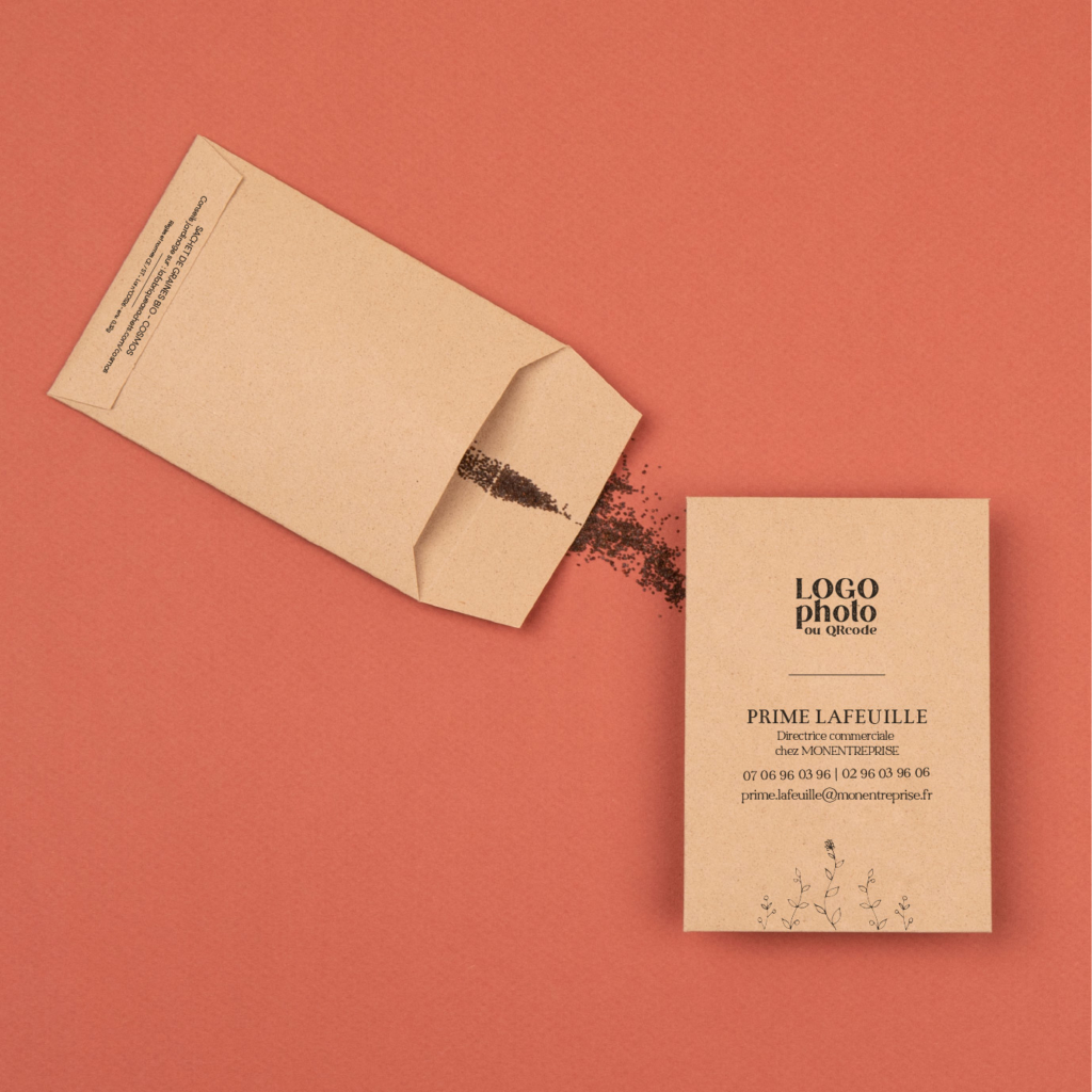 Le support cartonné est entièrement personnalisable : logo, nom, fonction, coordonnées, site web, QR code ou message sur mesure. Le design s’adapte à votre identité visuelle pour rester cohérent avec votre image de marque, tout en proposant un format original qui capte l’attention. Contrairement à une carte traditionnelle souvent oubliée, ce sachet se conserve, se transmet, et les graines se sèment.